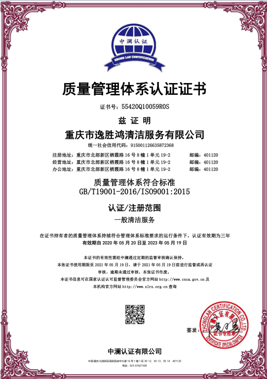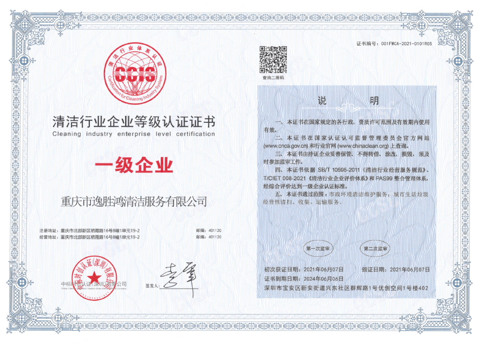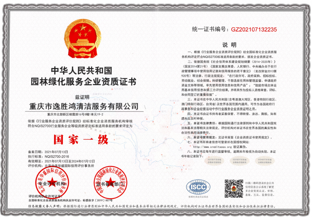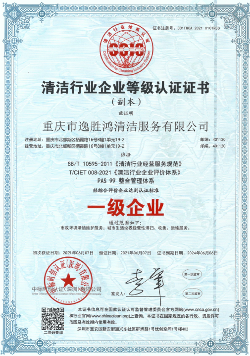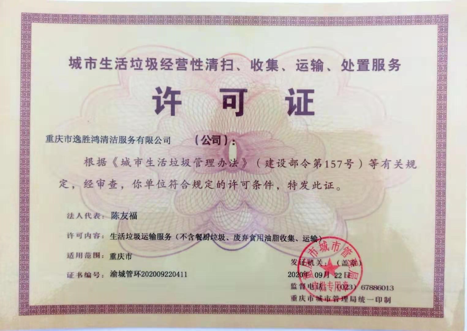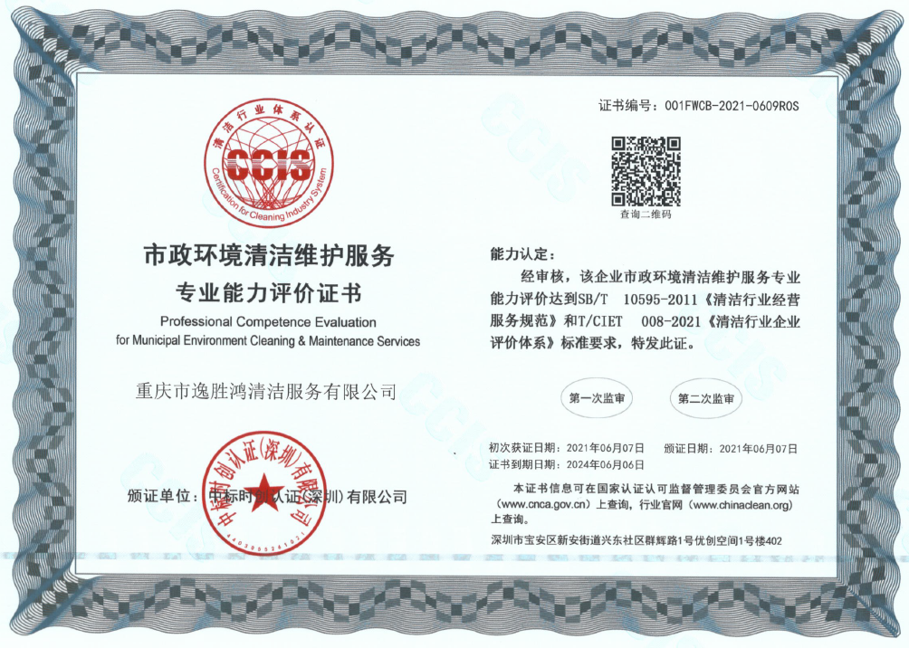 重庆市逸胜鸿清洁服务有限公司成立于2007年08月02日,注册资金5008万元整,是西南地区最为专业的清洁公司之一。公司经营范围主要包括:清洁服务;家政服务;垃圾清运服务;园林绿化服务;废旧物资回收;清洁用品、清洁剂、普通机械设备销售;企业管理咨询;病虫害防治;环境污染治理;物业服务;城市生活垃圾经营性清扫、收集、运输服务。